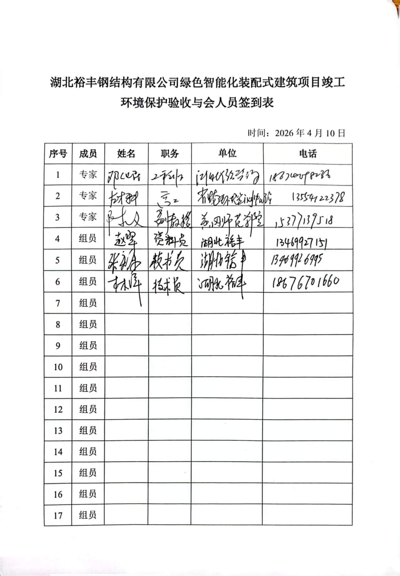 2026年4月10日,湖北裕丰钢结构有限公司根据国家有关法律法规的要求,组织对湖北裕丰钢结构有限公司绿色智能化装配式建筑项目以下简称《验收表》)进行技术审查。